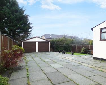 Rear Enclosed garden, laid to lawn with paved area providing off road parking for multiple vehicles and giving access to the detached double garage.