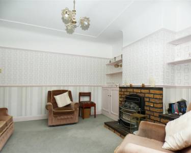 with feature fireplace incorporating living flame coal effect gas fire, picture rail, French doors onto rear garden.