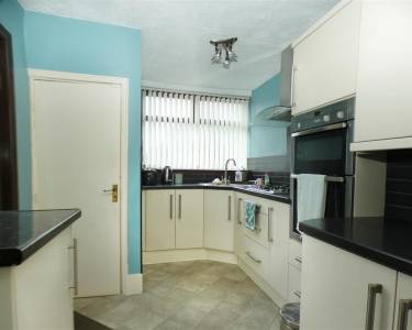 equipped with a matching range of base and wall units, working surfaces, corner 1.5 bowl stainless steel sink, built in double oven and gas hob with extractor hood over, cupboard with plumbing for washing machine, tiled splashbacks, space for fridge freezer, windows to the side and rear elevations, door to garden.