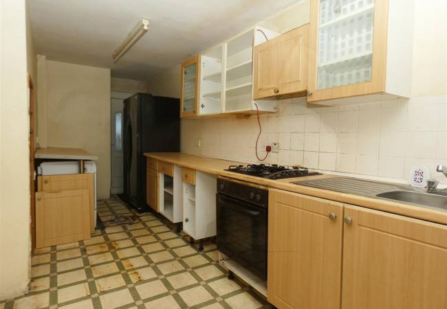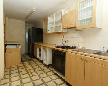 with wall and base units, working surfaces, single drainer stainless steel sink, plumbing for washing machine, gas cooker point, understairs cupboard, door to the front elevation, window and door to the rear.
