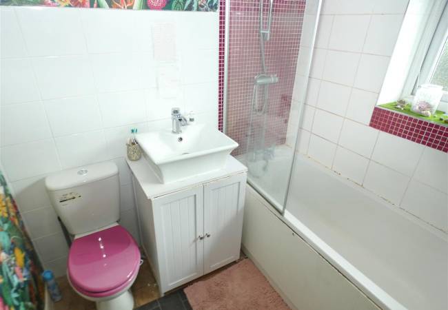 comprising of a three piece suite including panelled bath with shower attachment over, low level WC, wash hand basin, part tiled walls, heated chrome towel radiator, window to the rear elevation.