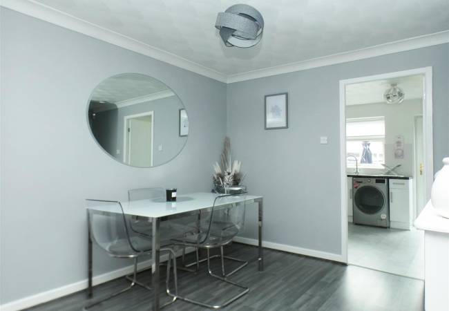equipped with a matching range of base and wall units, working surfaces, single drainer stainless steel sink, built in oven and hob with extractor hood over, plumbing for washing machine, space for fridge freezer, tiled splashbacks, window and door onto rear garden.