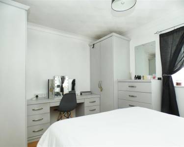 double room with a range of fitted wardrobes, drawers and dressing table unit, laminate flooring and window to the front elevation.