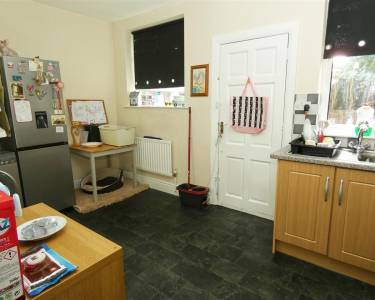 equipped with a matching range of base and wall units, working surfaces, single drainer stainless steel sink, built in oven and hob with extractor hood over, plumbing for washing machine, tiled splashbacks, two windows and door to the rear elevation.