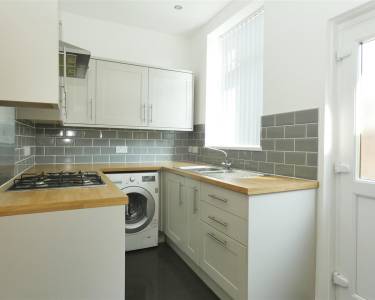 equipped with a matching range of base and wall units, working surfaces, 1.5 bowl stainless steel sink, built in oven and hob with extractor hood over, space for fridge freezer, tiled splashbacks, tiled floor, spot lighting, two windows and door to the rear elevation.