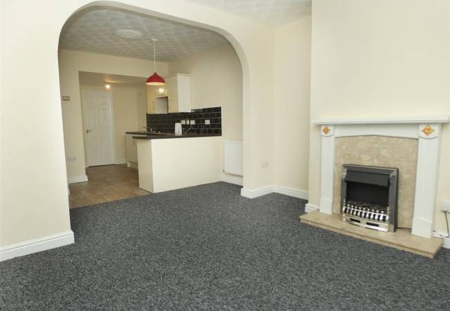 with feature fireplace and electric fire, window to the front elevation and open through to:-