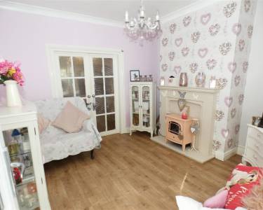 with feature fireplace, laminate flooring, window to the front elevation and double doors through to:-