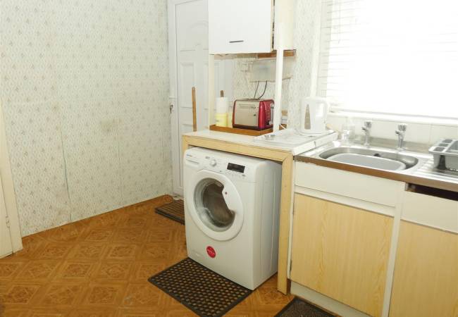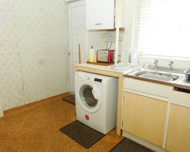 with single drainer sink unit and base units, wall unit, worktop, plumbing for washing machine, gas cooker point, windows to the side and rear elevations and door to rear garden.