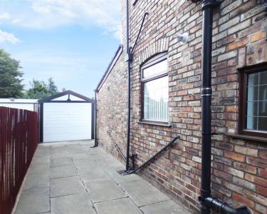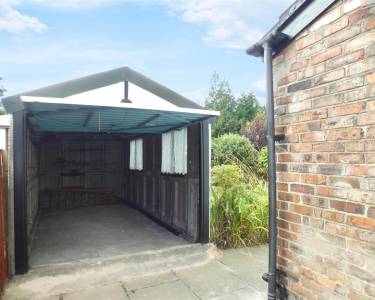 Block paved driveway providing off road parking with double timber gates giving access to detached garage.