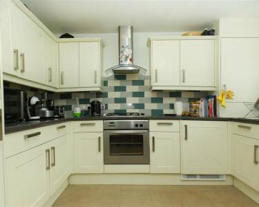 equipped with a matching range of base and wall units, working surfaces, single drainer stainless steel sink, built in oven and hob with extractor hood over, tiled splashbacks, integrated fridge freezer, washing machine and tumble dryer, space for table and chairs, window to the rear elevation and French doors to:-