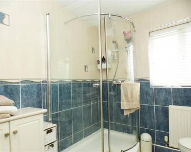 comprising of three piece suite including shower cubicle, built in vanity wash hand basin and low level WC, built in cupboards, tiled walls and floor, window to the front elevation.
