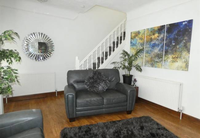 With laminate flooring, feature fireplace incorporating a pebble effect gas fire, picture rail to walls, staircase leading to the first floor and door with glass panels opening to the dining kitchen.
