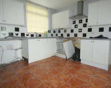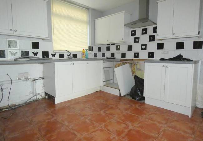 With wall and base units, chimney style extractor hood, space for cooker, plumbing for washing machine, tiled flooring and window to the front elevation.