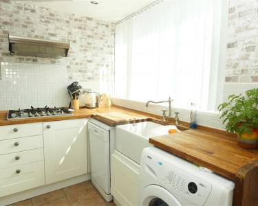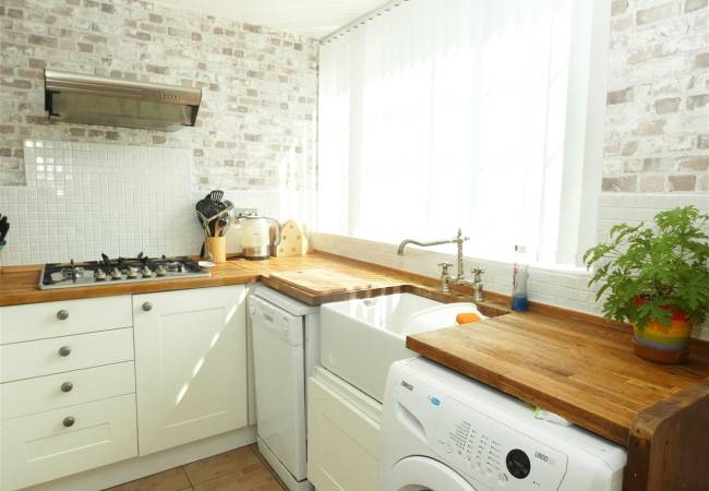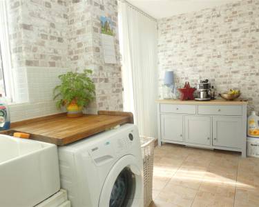 equipped with a matching range of base and wall units, butchers block working surfaces, Belfast sink, built in double oven and five burner gas hob with extractor hood over, space for American style fridge freezer, plumbing for washing machine, tiled splashbacks, tiled floor, spot lighting, window and French doors to the rear elevation.