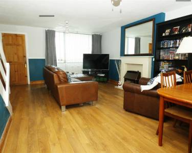 with feature fireplace, laminate flooring, dado rail, understairs cupboard and window to the front elevation.