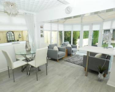 with dado rail, laminate flooring, wall light points and sliding patio doors through to:-
