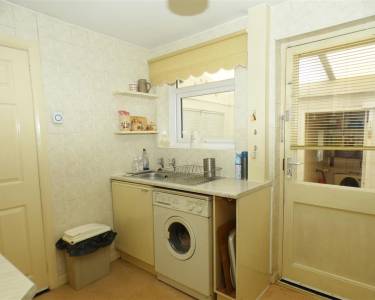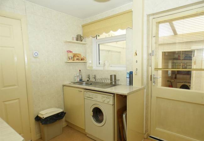 equipped with a matching range of base and wall units, working surfaces, single drainer stainless steel sink, gas cooker point, space for fridge and freezer, tiled walls, built in cupboard, window and door to rear.