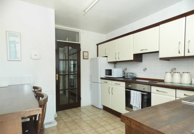 equipped with a range of base and wall units, working surfaces, single drainer 1.5 bowl stainless steel sink, built in oven and hob, plumbing for washing machine, breakfast bar, tiled splashbacks, tiled floor, window and door to the rear elevation.