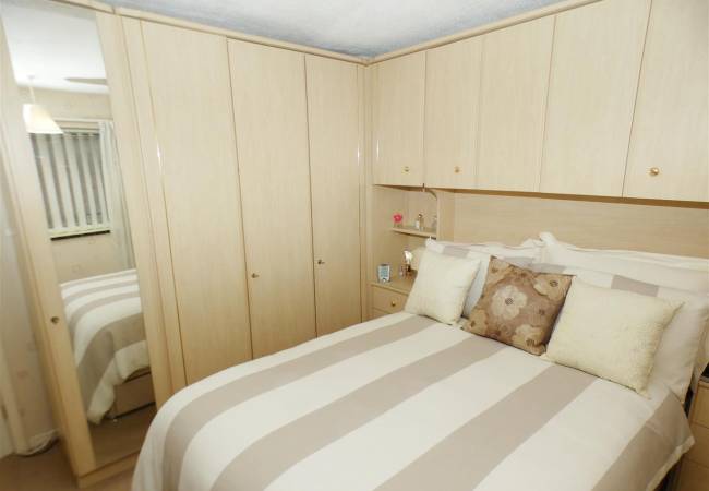 with a range of fitted wardrobes and cupboards, built in cupboard and window to the front elevation.
