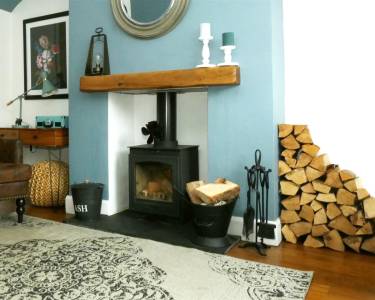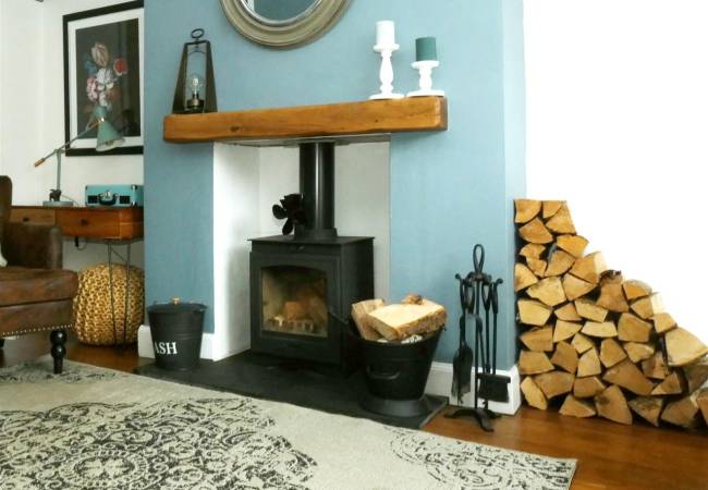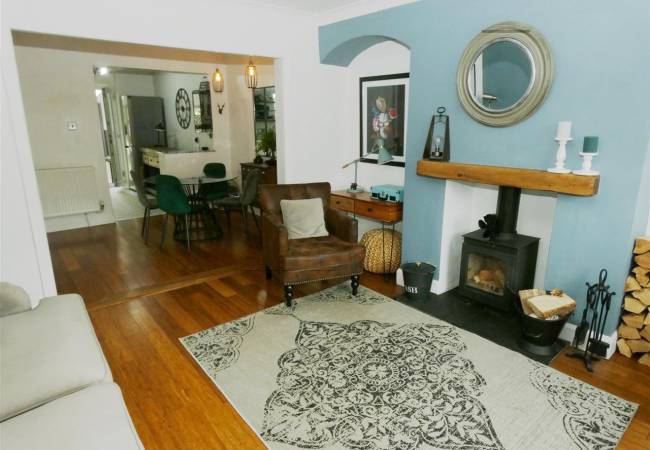 with feature fireplace incorporating log burning stove, oak mantel shelf, wood flooring, window to the front elevation and open through to:-