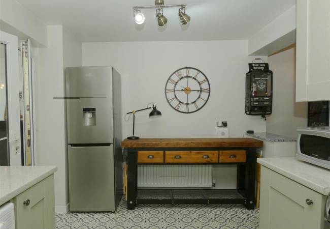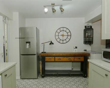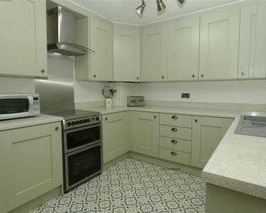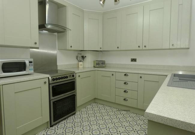 equipped with a modern range of base and wall units, working surfaces and upstands, 1.5 bowl moulded sink unit, electric cooker point, plumbing for washing machine, window and French doors onto:-