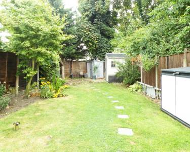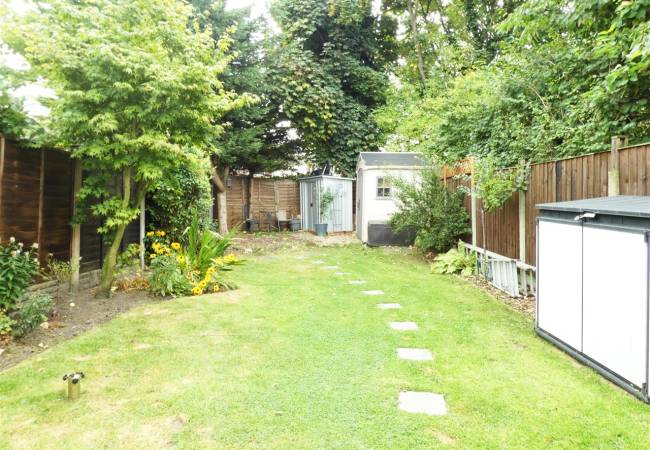 Rear Enclosed garden, predominantly laid to lawn, with gravelled area and artificial grass, two garden sheds and raised pond.