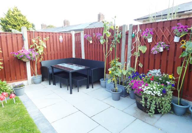 Well maintained enclosed garden, laid to lawn with beds and borders and paved patio areas.