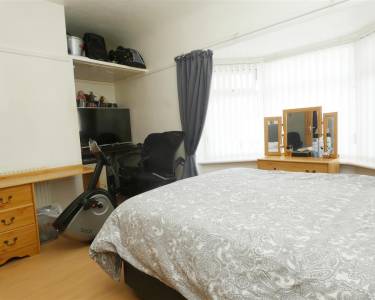 with living flame coal effect gas fire, laminate flooring, built in cupboard and bay window to the front elevation.