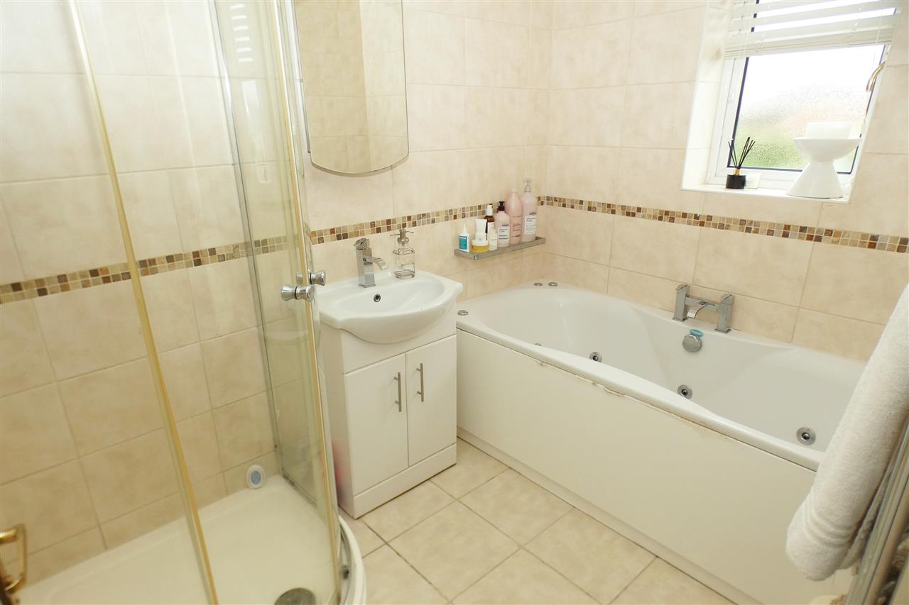 comprising of a three piece suite including Jacuzzi panelled bath, shower cubicle with fitment, vanity wash hand basin, tiled walls and floor, heated chrome towel radiator, window to the rear elevation.