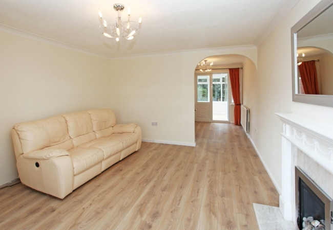 Large bay window overlooking green area and front garden. Large radiator, light , fireplace and wooden flooring.