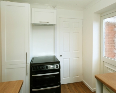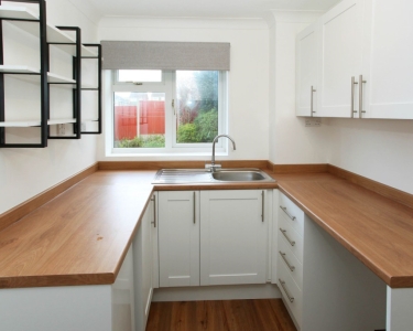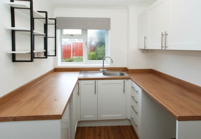 New fitted kitchen with one double wall cabinet, shelving one tall unit and 4/5 undercounted units
