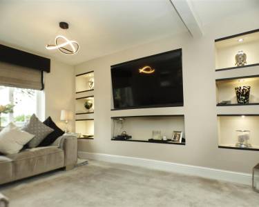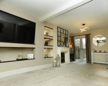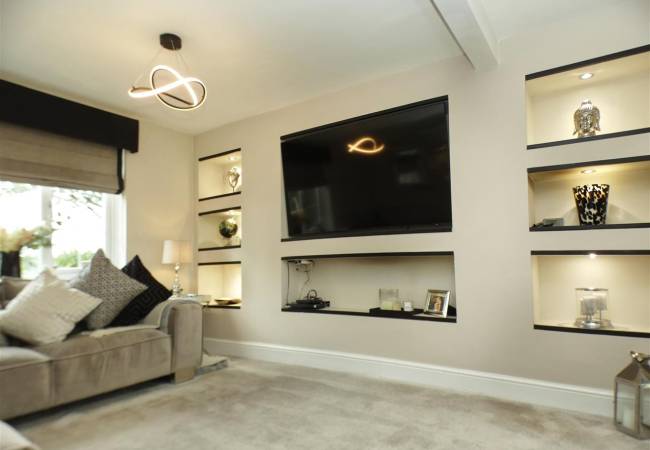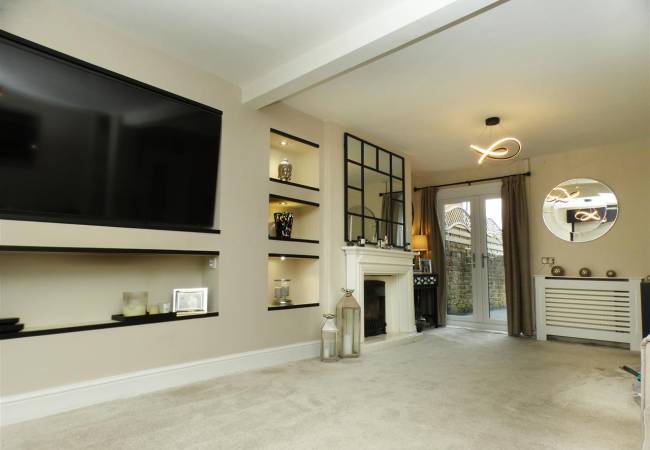with feature fireplace, built in TV and display niches, understairs cupboard, window to the front elevation and French doors onto rear garden.