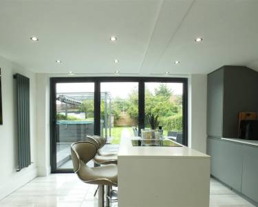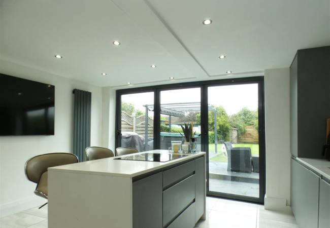 modern kitchen equipped with a matching range of base and wall units, granite working surfaces, under mount sink, island with breakfast bar seating, built in oven and hob, integrated fridge freezer, microwave and washing machine, tiled floor, spot lighting, vertical radiator and bi-folding doors onto rear garden.