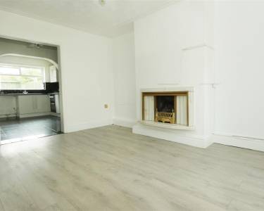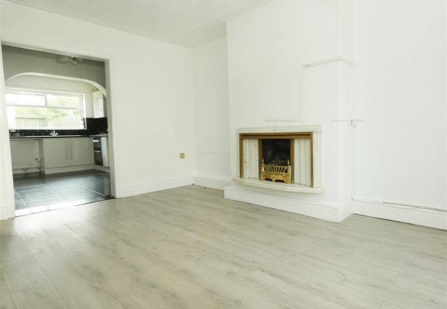 with feature fireplace incorporating living flame coal effect gas fire, bay window to the front elevation, laminate flooring and open through to:-
