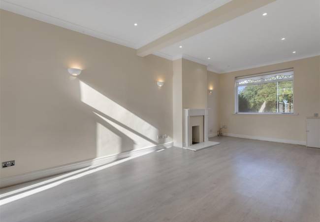 with feature fireplace, laminate flooring, spot lighting, wall light points, window to the front elevation.