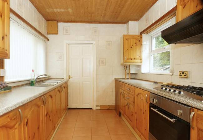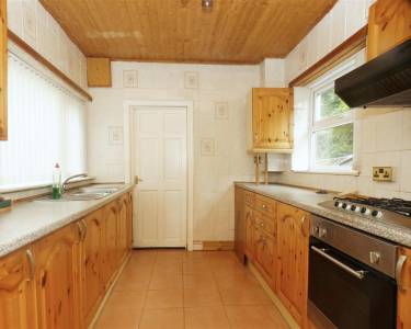 equipped with a matching range of base and wall units, working surfaces, 1.5 bowl stainless steel sink, built in oven and hob with extractor hood over, windows to the side elevations, tiled walls and floor, panelled ceiling.