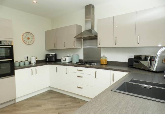 equipped with a range of contrasting base and wall units, working surfaces and upstands, 1.5 bowl moulded sink unit, built in double oven and hob with extractor hood over, integrated fridge freezer and dishwasher, Karndean flooring, spot lighting, French doors onto rear garden and door to:-