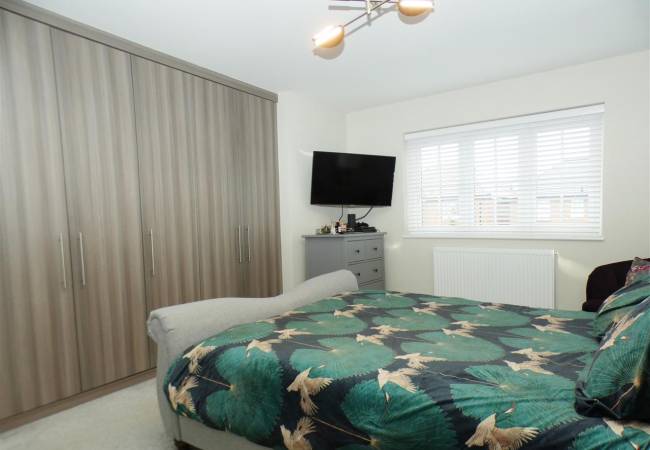 with a range of fitted wardrobes, window to the front elevation and door to:-
