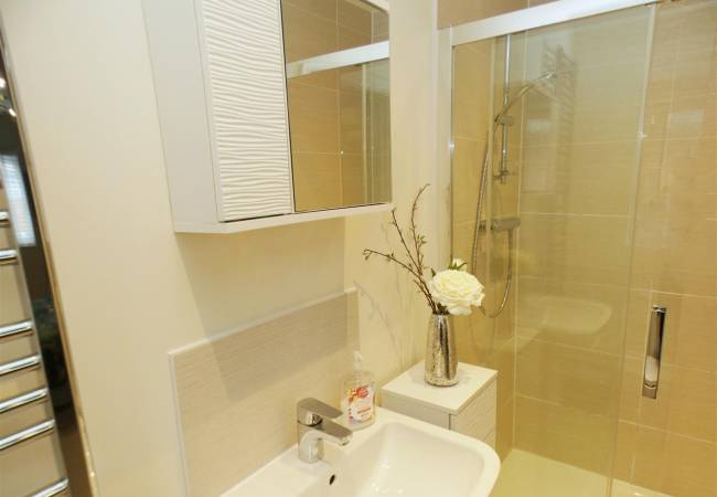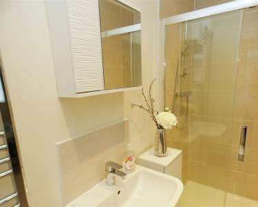 comprising of a shower cubicle, pedestal wash hand basin, low level WC, heated chrome towel radiator, part tiled walls, tiled floor, spot lighting and window to the side elevation.
