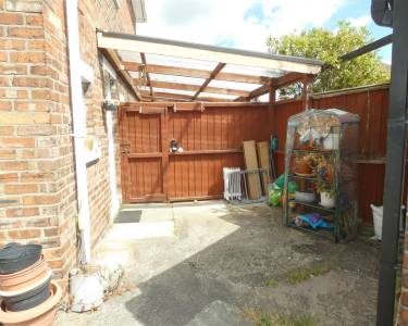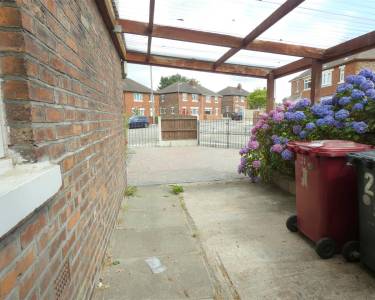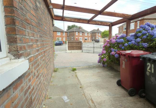 Side Side garden, laid to lawn with planted borders. Adjacent carport giving access to rear garden.