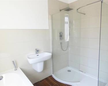 comprising of a four piece suite including panelled bath, shower cubicle with rainwater fitment, wash hand basin, low level WC, tiled floor, part tiled walls, heated chrome towel radiator, window to the rear elevation.