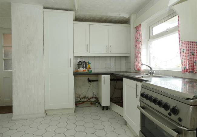 with a range of base and wall units, working surfaces, single drainer stainless steel sink, gas cooke point, plumbing for washing machine, tiled floor, part tiled walls, window to the front elevation, door to side.
