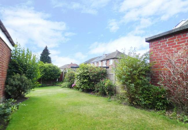 Well maintained enclosed garden, laid to lawn with beds and borders extending to the side, paved patio area.