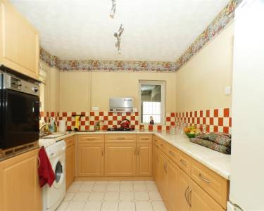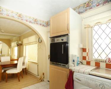dining area with laminate flooring, window to the rear elevation and open arch to kitchen area equipped with a matching range of base and wall units, working surfaces, single drainer stainless steel sink, built in oven and hob, plumbing for washing machine, tiled floor, tiled splashbacks, window and door to the rear elevation.