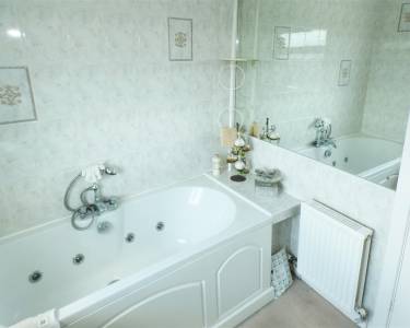 comprising of a three piece suite including Jacuzzi panelled bath, pedestal wash hand basin, low level WC, tiled walls, window to the rear elevation.