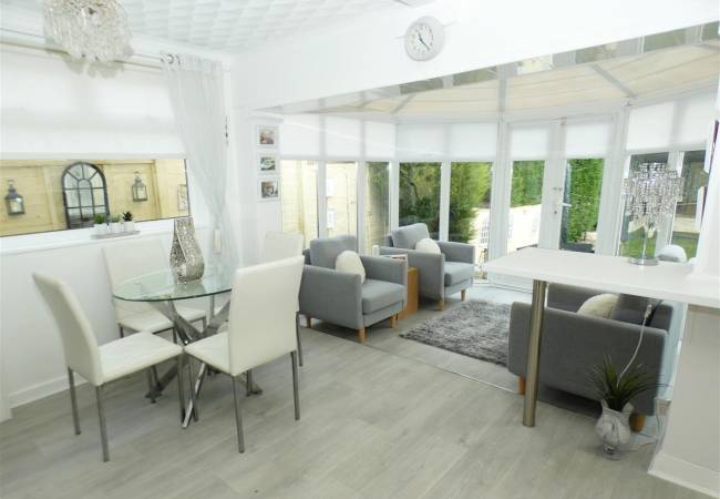with dado rail, laminate flooring, wall light points and sliding patio doors through to:-