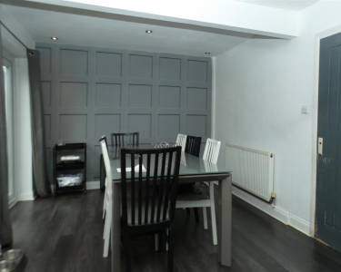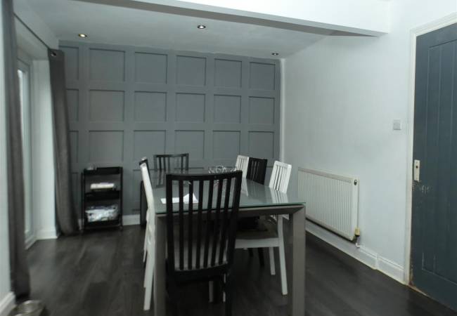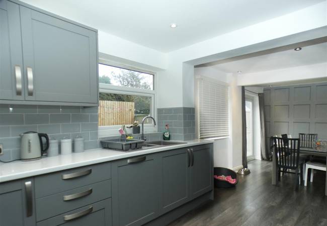 equipped with a matching range of base and wall units, working surfaces, 1.5 bowl moulded sink unit, integrated dishwasher, space for range cooker with extractor hood over, space for American style fridge freezer, tiled splashbacks, laminate flooring, spot lighting, two windows and French doors onto rear garden.